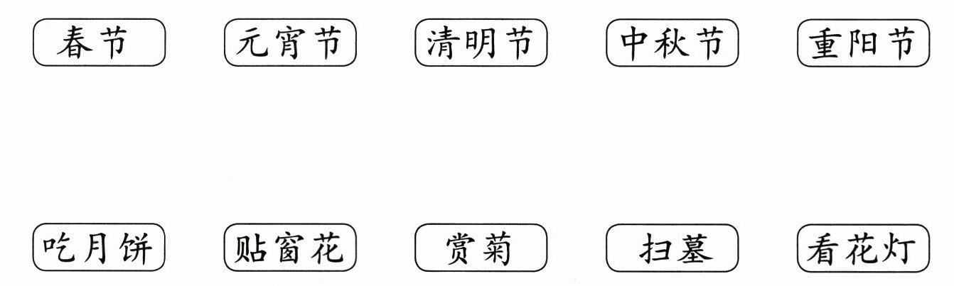 【解析】:本题可根据各个节日的习俗来进行连线。春节有贴窗花的习俗;元宵节有看花灯的习俗;清明节有扫墓的习俗;中秋节有吃月饼的习俗;重阳节有赏菊的习俗。