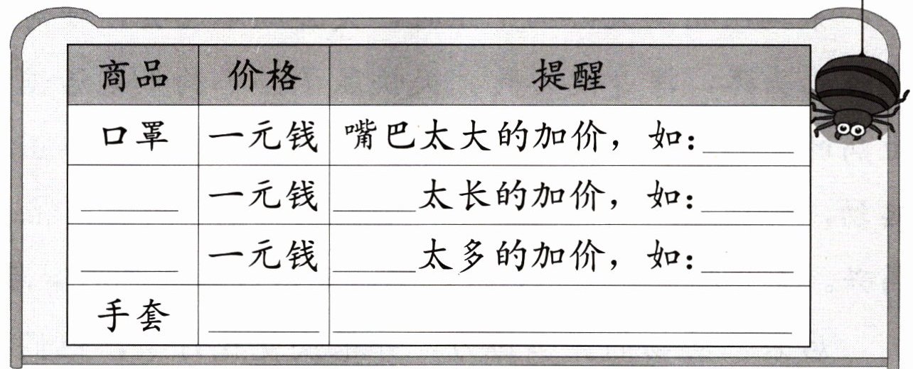 三、《蜘蛛开店》中的蜘蛛因考虑不周而吓得不敢再开商店,现在又有一只蜘蛛想开店卖东西,请你帮它填一填。