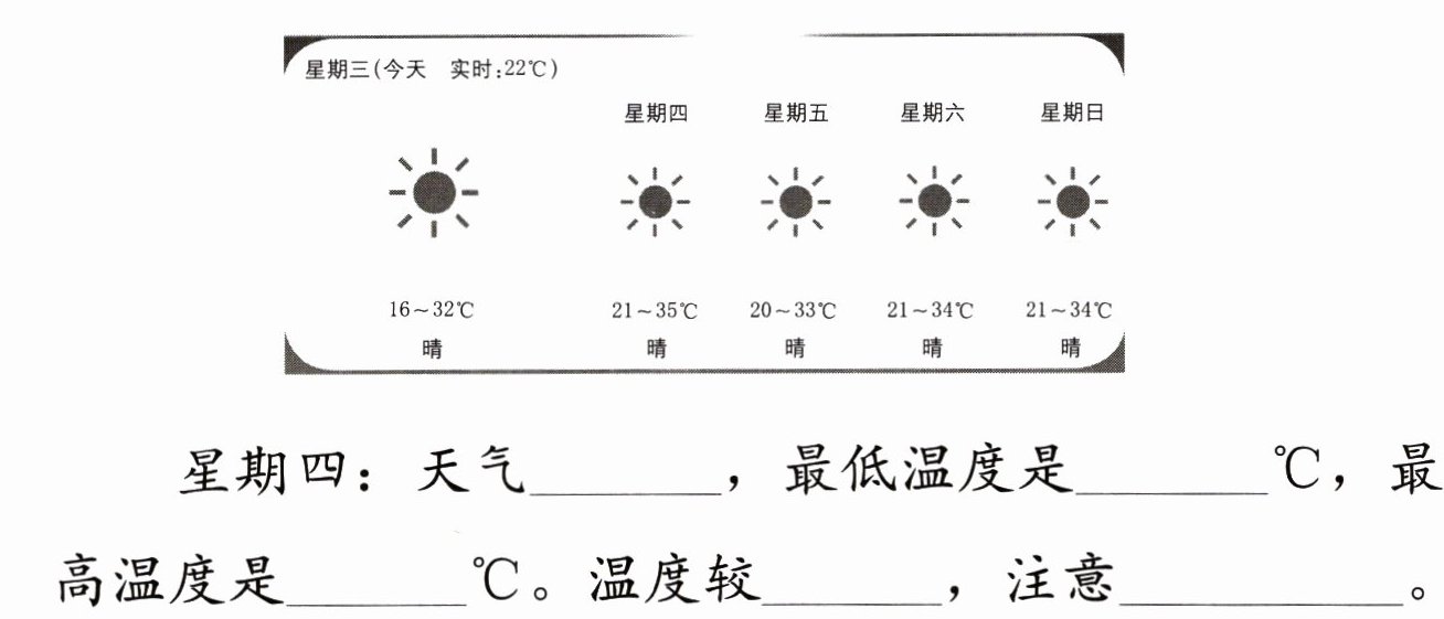 星期四:天气晴,最低温度是$21^{\circ}C$,最高温度是$35^{\circ}C$。温度较高,注意防暑降温。