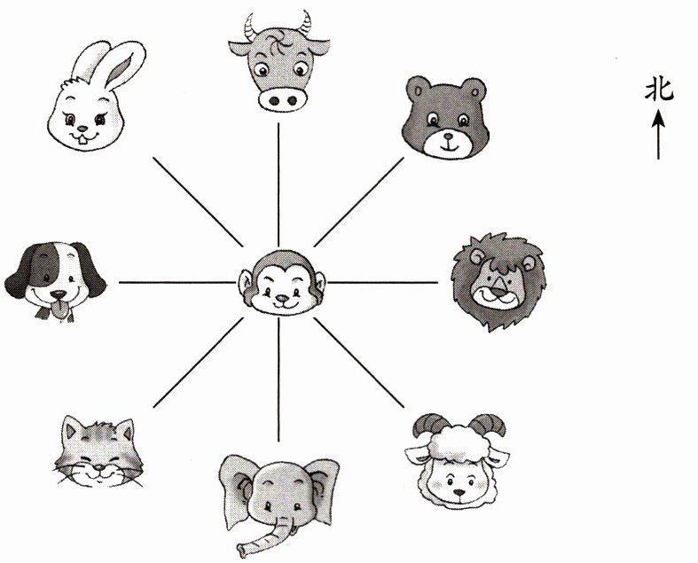 (1)以小猴为观测点,看其他动物在小猴的什么方向。