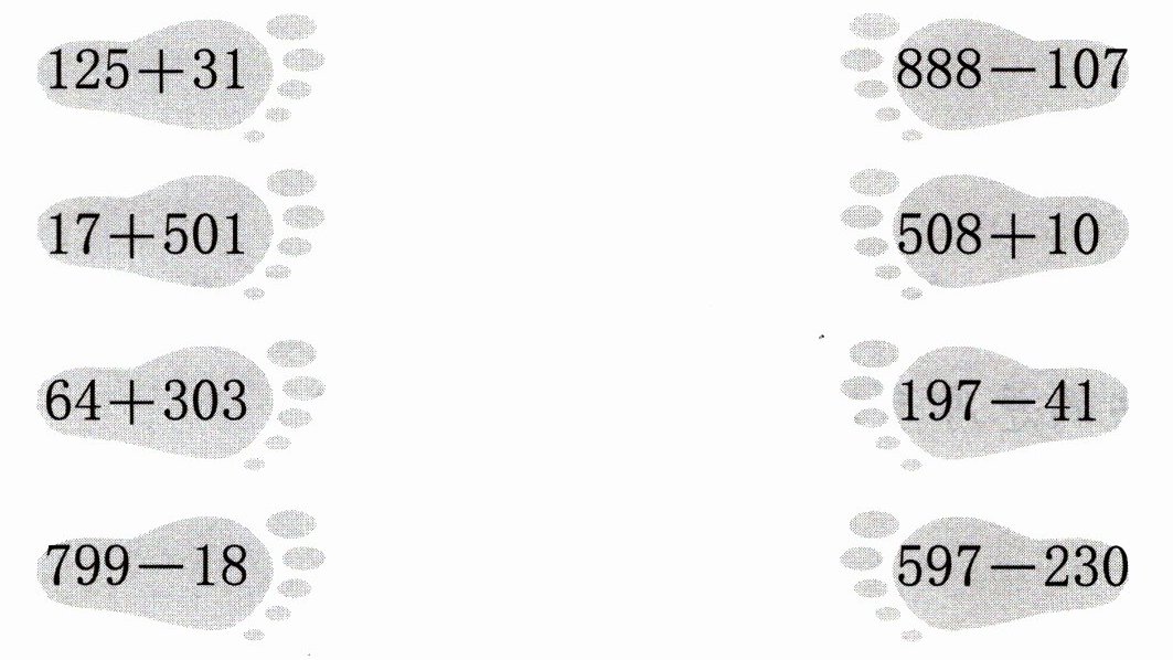 通过计算可知$125 + 31$与$197 - 41$得数相等,$888 - 107$与$799 - 18$得数相等,$17 + 501$与$508 + 10$得数相等,$64 + 303$与$597 - 230$得数相等。