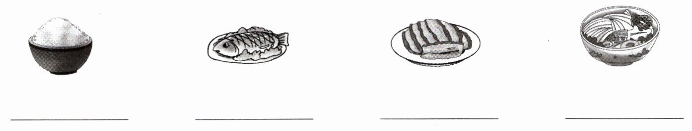 【解析】:本题可根据图片内容写出对应的英文单词。第一幅图是一碗米饭,“米饭”对应的英文单词是“rice”;第二幅图是一条鱼,“鱼”对应的英文单词是“fish”;第三幅图是一些肉,“肉”对应的英文单词是“meat”;第四幅图是一碗面条,“面条”对应的英文单词是“noodles”。