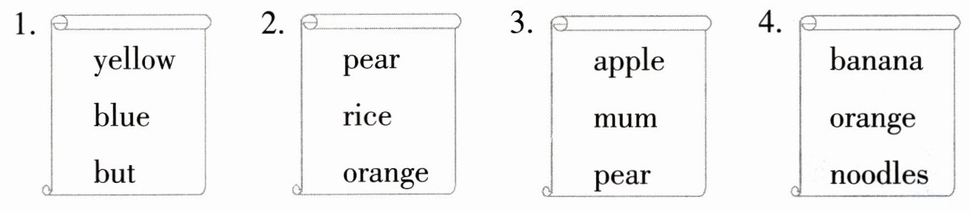 第1组:yellow(黄色)、blue(蓝色)都是颜色类单词,but(但是)是连词,与其他两个单词类别不同。