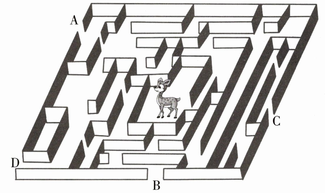 小鹿在迷宫中迷了路走不出来了,请你进入迷宫找到它。A、B、C、D四个入口中,从哪一个入口走入迷宫,才能找到小鹿?