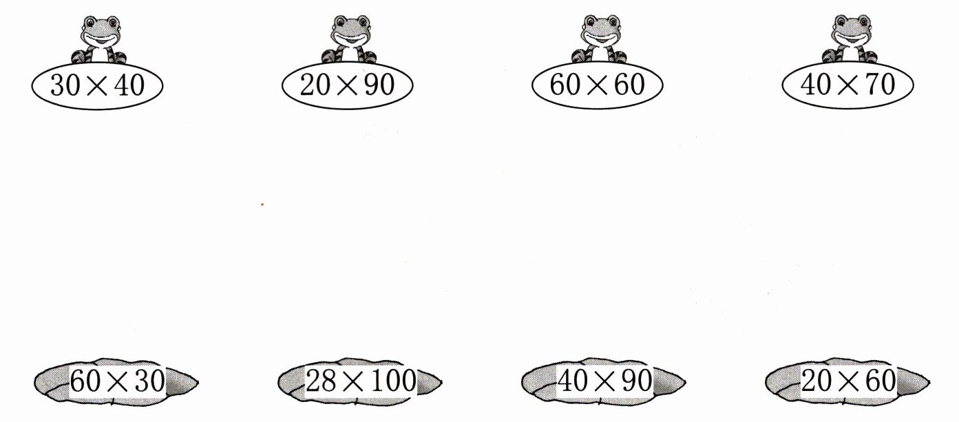 本题考查两位数乘两位数的计算及比较大小,根据题目要求,需要将青蛙与其对应的荷叶上的乘法算式匹配起来,计算出每个算式的结果,然后找出匹配的荷叶。