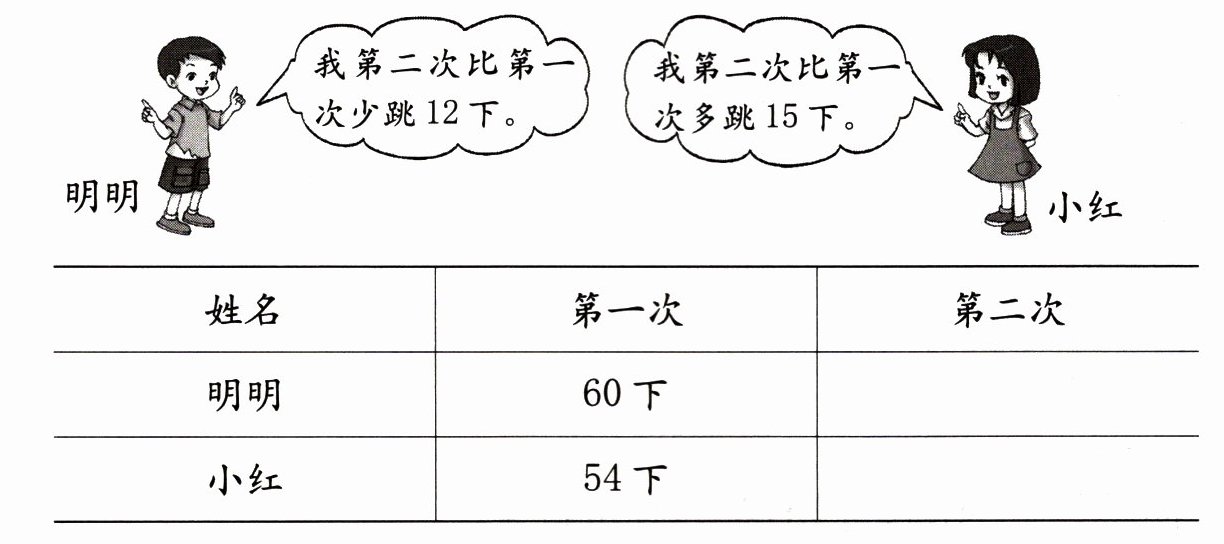 已知小红第一次跳$54$下,第二次比第一次多跳$15$下,那么小红第二次跳的次数为$54 + 15 = 69$(下)。