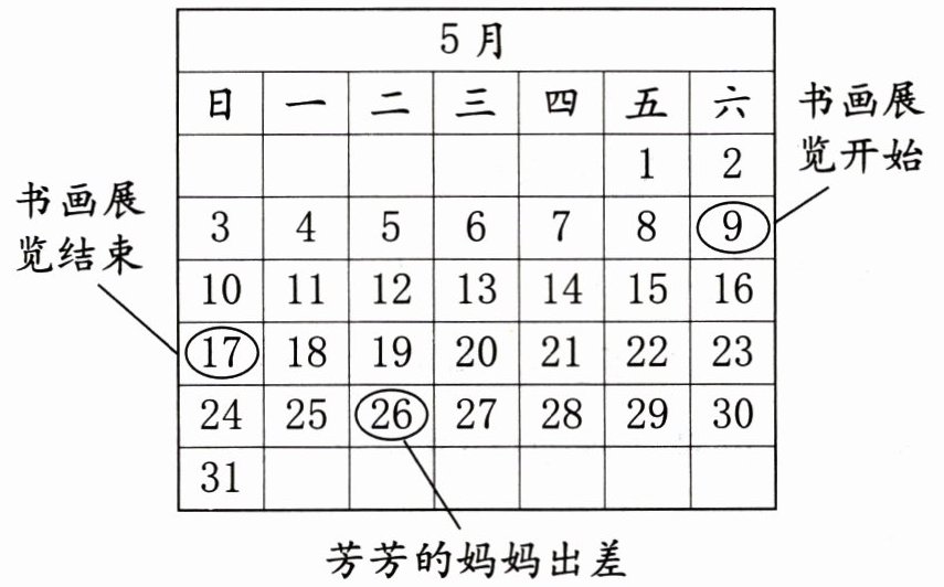 ②6月2日芳芳的妈妈出差回来,回来那天是星期几?她一共
