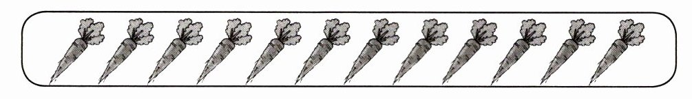 (3) 胡萝卜总数为$12$个,把$12$个胡萝卜平均分成$6$份,每份是$12÷6 = 2$(个),求它的$\frac{5}{6}$是多少个,就是求$5$份是多少个,所以是$2×5 = 10$(个)。