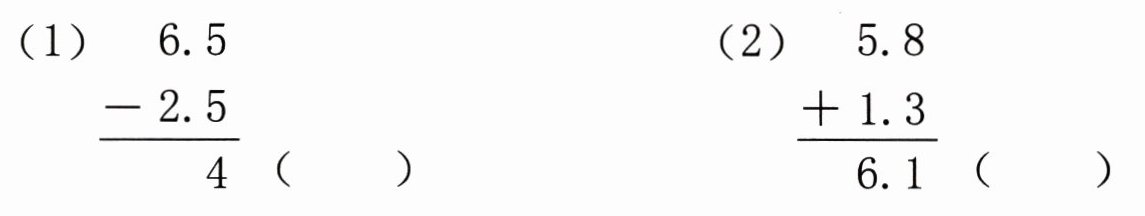 (2)×,改正:$\begin{array}{r} 5.8\\ +1.3\\ \hline 7.1\end{array}$