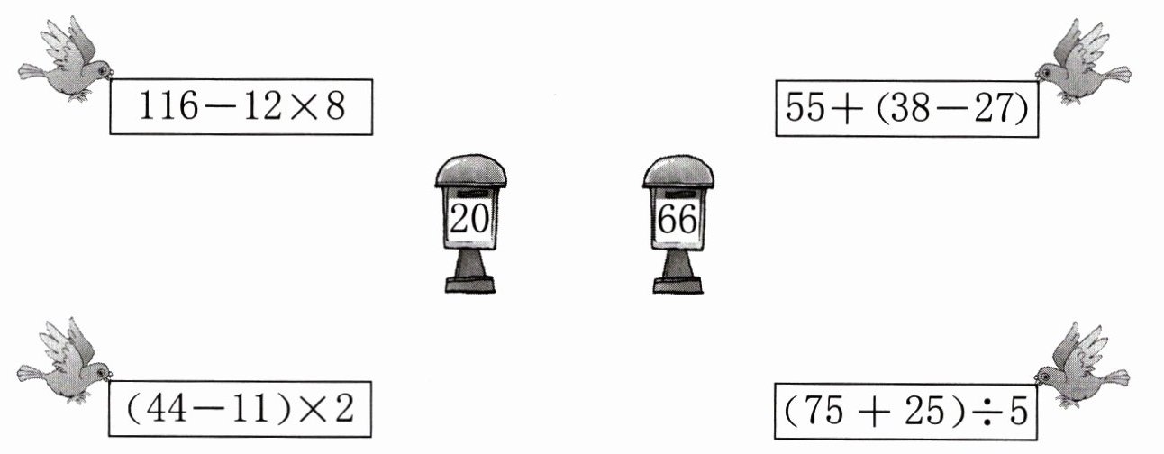 【解析】:本题可根据四则运算的运算顺序分别计算出各个算式的结果,再与对应的数值相连。四则运算的运算顺序为:先算乘除,后算加减,有括号的先算括号里面的。