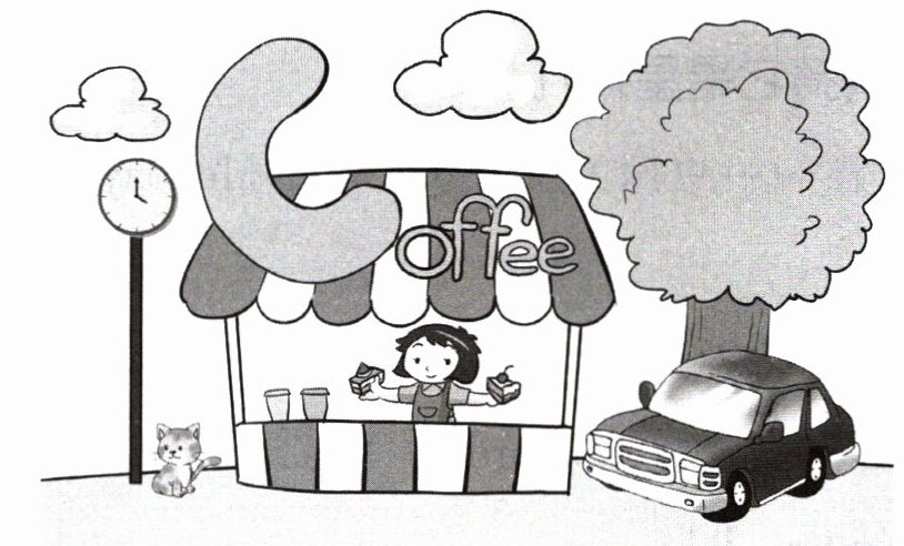 从图中可以看到有猫(cat)、时钟(clock)、咖啡店(coffee shop)、汽车(car)、树(tree)、云(cloud)等物品。其中猫(cat)、时钟(clock)、咖啡店(coffee shop)、汽车(car)的英文名称是以字母“C”开头的。