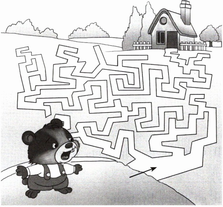 小熊先向前直走,遇到第一个岔路口时,选择向右走,然后一直沿着这条路走,遇到下一个岔路口时,再选择向右走,接着直走,在遇到岔路口时选择向左走,之后沿着这条路直走即可到达小熊的家。(答案不唯一)