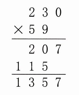 $\begin{array}{r r r}&&&&2&3&0 \\ ×&&&&5&9 \\ \hline &&&2&0&7&0\\&&1&1&5&0 \\ \hline&&1&3&5&7&0\end{array}$