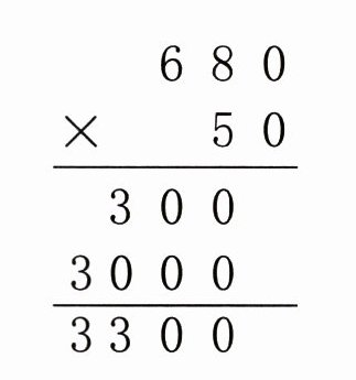 对于$680×50$,错在第二个部分积3000多乘了一个0,因为50中的5在十位上,表示5个十,即50,所以只需用50的十位上的5去乘680,得到34000,而这里的3000是错误的,同时最终结果3300也错误,正确结果应为34000。