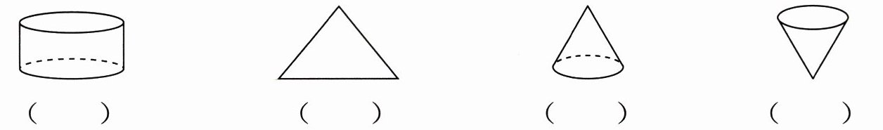 【解析】:本题考查对圆锥图形的认识,圆锥是一种由一个圆形底面和一个顶点,以及连接这个顶点和底面圆周上任意一点的曲面所围成的立体图形。从所给图形中找出符合圆锥特征的图形,然后在它下面的括号里画“√”。