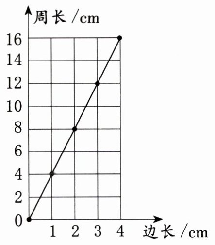 (1) 从图中可以看出,这是一个正比例函数图像,设边长为$x$,周长为$y$,则$y=kx$,把$(4,16)$代入得$16 = 4k$,$k = 4$,所以周长与边长的比例关系式为$y = 4x$。
