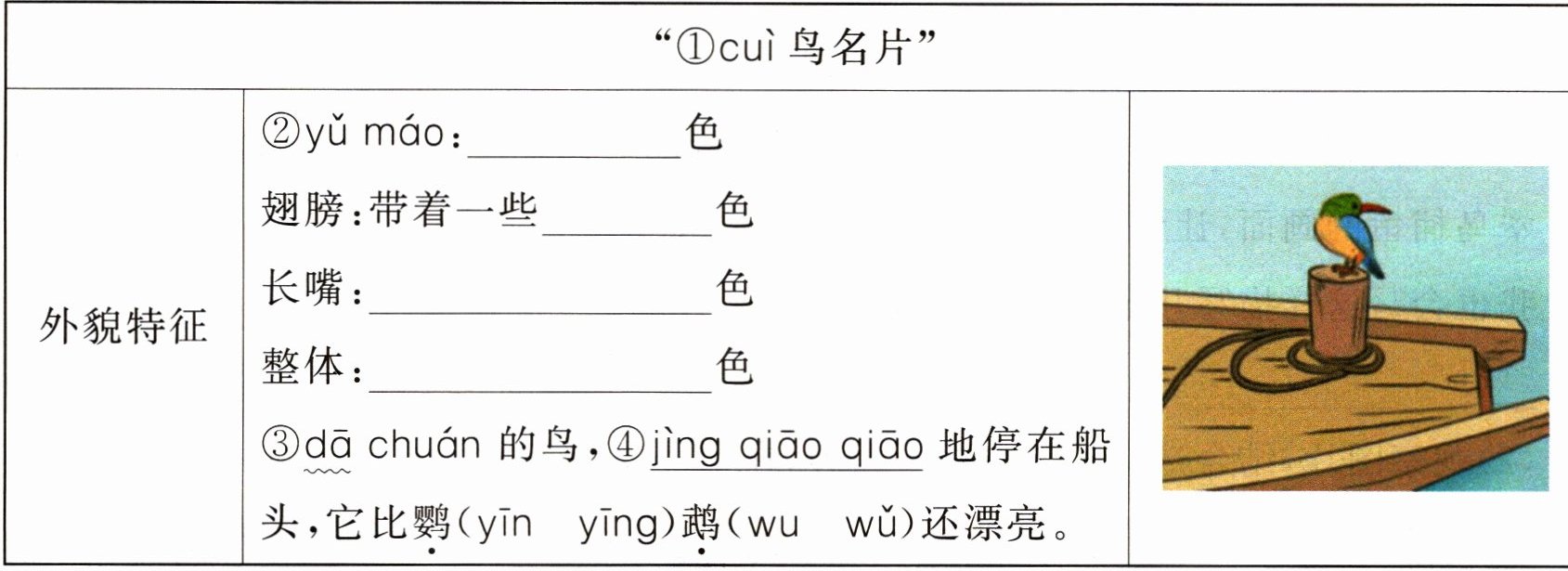)。5. “名片”中描写鸟的外形时,运用了表示颜色的词语。请你用表示颜色的词语把下面的句子补充完整。