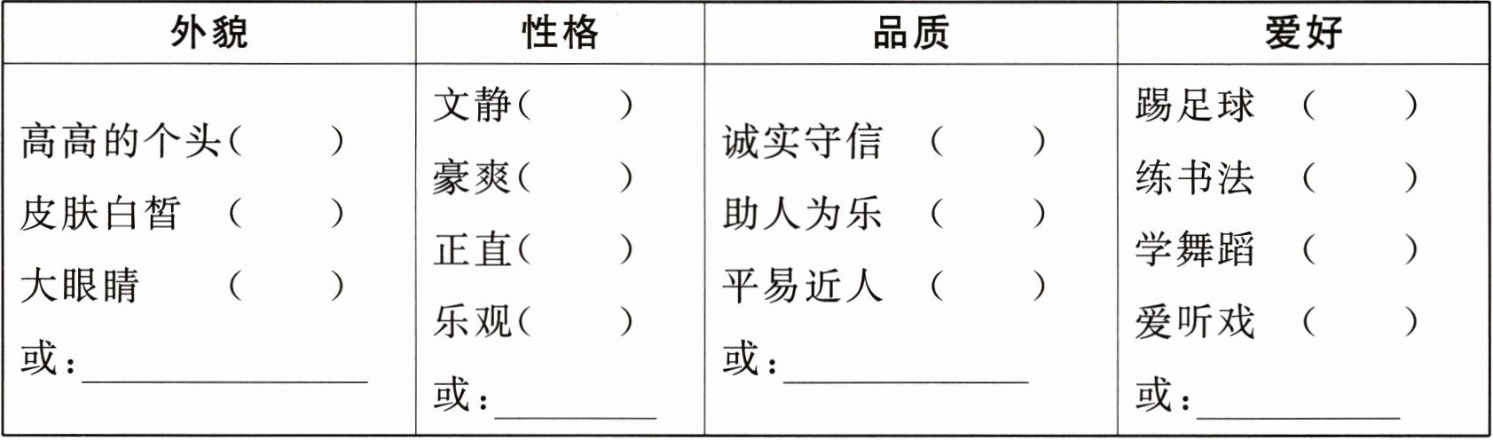 结合习作要求,选择自己想写的素材,在括号中打“√”,或填一填。