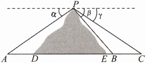 18. (17分)如图所示,$A$,$B$,$C$为山脚两侧共线的三点,在山顶$P处测得三点的俯角分别为\alpha$,$\beta$,$\gamma$.计划沿直线$AC$开通穿山隧道,请根据表格中的数据,计算隧道$DE$的长度.