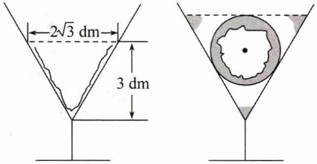 13. 如图,圆锥状容器内盛有水,水深3 dm,水面直径$2\sqrt {3}dm$放人一个铁球后,水恰好把铁球淹没,则该铁球的体积为______$dm^{3}$.
