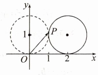 15.如图,在平面直角坐标系$xOy$中,一单位圆的圆心的初始位置在$(0,1)$,此时圆上一点$P的位置在(0,0)$,圆在$x$轴上沿正向滚动. 当圆滚动到圆心位于$(2,1)$时,求$\overrightarrow {OP}$的坐标.