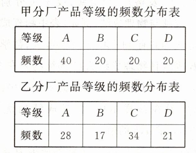 (1)根据频数分布表,甲分厂A级品的频数是40,总的试验次数是100,所以甲分厂加工出来的一件产品为A级品的概率是$\frac{40}{100} = 0.4$。同理,乙分厂A级品的频数是28,总的试验次数也是100,所以乙分厂加工出来的一件产品为A级品的概率是$\frac{28}{100} = 0.28$。