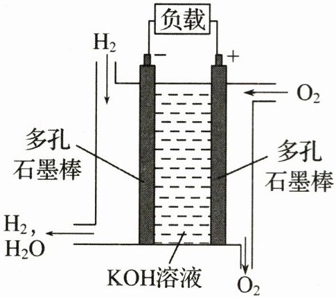 16. (15分)我国自主研发的空间燃料电池首次在轨试验成功完成,推动了宇航燃料电池的应用发展。如图为氢氧燃料电池的结构示意图,电解质溶液为${KOH}$溶液,电极材料为疏松多孔石墨棒。当氧气和氢气分别连续不断地从正、负两极通入燃料电池时,便可在闭合回路中不断地产生电流。