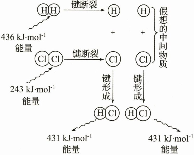 15. (14分)实验测得$1\ {mol H_{2}}与1\ {mol Cl_{2}}反应生成2\ {mol HCl}$时,放出$184.6\ {kJ}$的热量,其理论分析数据与实验数据略有差异,如图所示为上述反应能量变化的理论分析示意图。