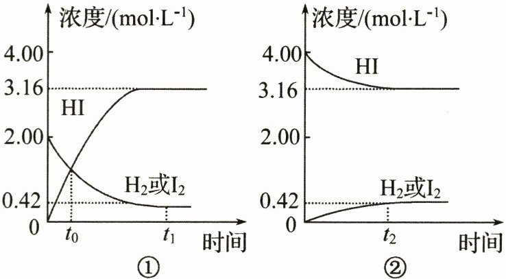 D.图①②中当$c(HI)= 3.16mol·L⁻^1$时,反应达到平衡状态