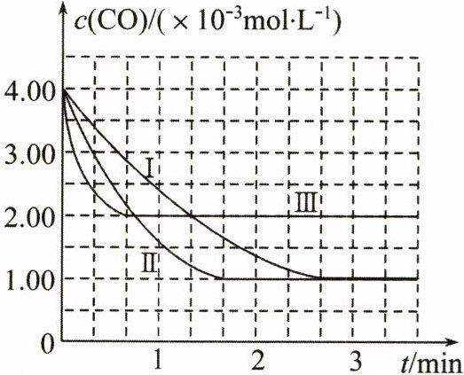 已知实验Ⅰ、Ⅱ、Ⅲ中NO和CO的初始浓度均相同,分别为$6.50×10⁻^3mol·L⁻^1、$$4.00×10⁻^3mol·L⁻^1。$