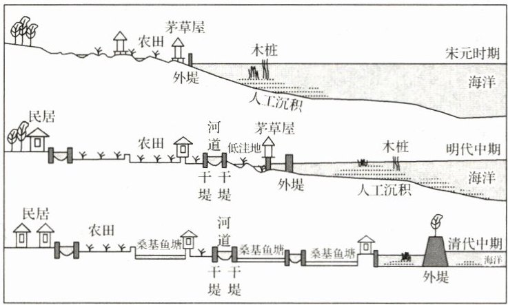 (2)通过堤坝围垦、增加土地面积,扩大种植规模;沿江(河)堤坝便于防洪、灌溉,提高土地质量,改善种植条件;沿海堤坝防止海潮入侵,保护农田安全。
