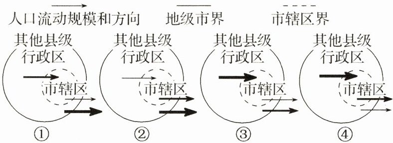 1. A 2. C 3. B 第 1 题,读图对比 2020 年和 2010 年的市辖区人口和其他县级行政区常住人口数量,可知市辖区人口增加,但增幅较小,其他县级行政区人口减少,减幅较大,总人口明显减少。因此人口流动情况为其他县级行政区人口少部分流向市辖区,较多人口流出该地级市;而市辖区流出地级市的人口应少于其他县级行政区流入市辖区的人口,图中箭头粗细可以表示人口流动量的大小,①图符合题意;②图市辖区流出地级市的人口多于其他县级行政区流入市辖区的人口,会造成市辖区人口减少;③和④其他县级行政区人口流入市辖区的人口远高于流出地级市的人口。第 2 题,我国属于发展中国家,人口迁移以青壮年人口迁移为主,市辖区流出地级市的人口少于其他县级行政区流入市辖区的人口,为人口净迁入区,青壮年人口的迁入会降低老年人口比重和劳动人口的平均年龄,增加劳动人口比重;其他县级行政区总人口数量远大于市辖区人口数量,市辖区老年人口数量应小于其他县级行政区。第 3 题,当今影响我国人口迁移的最主要的因素是经济因素,因此具有类似常住人口变化状况的地级市,一般具有相似的经济发展趋势。