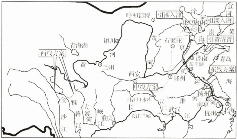 材料一 在我国南水北调工程中,西线调水能缓解西北缺水问题,预计调水成功后,西北地区的资源环境承载力可增加一个亿。而三峡水库的建设,淹没大量土地,百万移民需安置。下面为南水北调路线图。