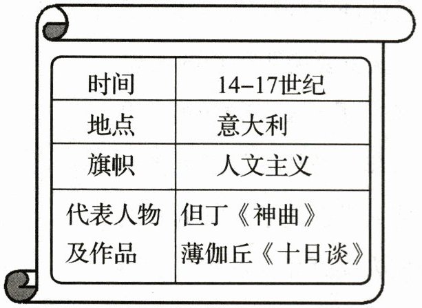 B 结合所学可知,文艺复兴兴起于 14-17 世纪,以人文主义为核心,但丁、薄伽丘、彼特拉克是文艺复兴的代表人物,被称为“文学三杰”,故 B 正确;图片中未反映科学革命内容,排除 A;宗教改革主张信仰得救,排除 C;启蒙运动以理性主义为核心,排除 D。