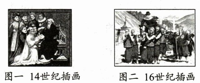 D 图一是 14 世纪的,当时世界还处于相对孤立隔绝的状态,西方对中国不了解,所以只能按照中世纪欧洲的服饰来画。图二时间是 16 世纪,此时已经发生了新航路开辟,打破了世界相对孤立隔绝的状态,各地区联系加强,所以图二中国人的形象更符合实际。