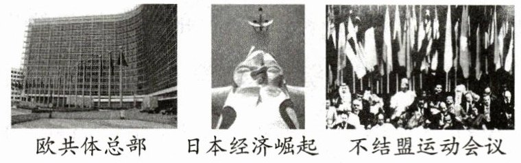 A 材料图片反映了欧共体、日本经济崛起、不结盟运动,这体现了世界多极力量的成长,故选 A。仅凭材料信息无法体现世界日益联系成不可分割的整体,B 错误;世界市场开始形成是在新航路开辟时,C 错误;材料信息并不能说明发达国家改善与发展中国家关系,D 错误。