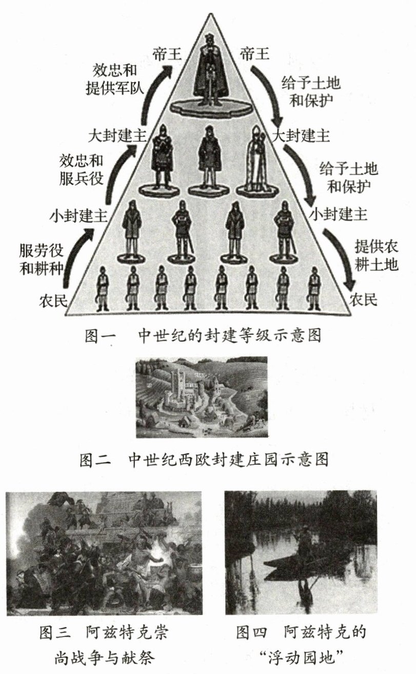 (1)题西欧:根据“中世纪的封建等级示意图”得出政治上实行封君封臣的封建等级制;根据“中世纪西欧封建庄园示意图”得出经济上封建庄园经济盛行。阿兹特克:根据“崇尚战争与献祭”得出政治上崇尚部族之间的战争与用人献祭神灵;根据“浮动园地”得出经济上发明了“浮动园地”的农耕方式。第