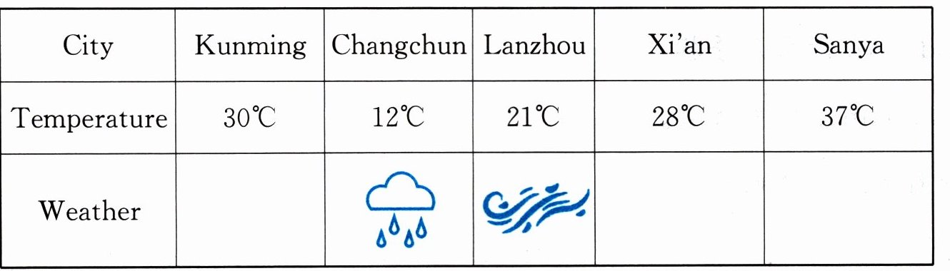 It's sunny and warm in Kunming. You need(需要) to wear your shirt and trousers. It's rainy and cold in Changchun. You need to wear your sweater. It's windy and cool in Lanzhou. You need to wear your coat and trousers. It's cloudy and warm in Xi'an. You need to wear your T-shirt and dress. It's hot and rainy in Sanya. You need to wear your T-shirt and shorts.