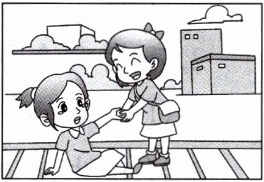 示例:一天,小雨和小青正走在去少年宫的路上,突然小青不小心摔倒了,她疼得哭了起来。小雨赶紧把小青扶了起来,然后对小青说:“小青,别哭了,再哭就成小花猫了。”听完小雨的话,小青笑着用手擦(cā)了擦眼泪,两个人继续向少年宫走去。