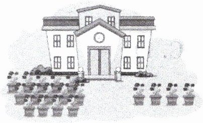从左边拿出5盆花放到右边,门口两边的花就一样多了。