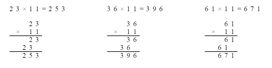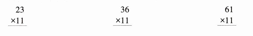 发现:一个两位数乘11,积的百位是这个两位数的十位数字,积的个位是这个两位数的个位数字,积的十位是这个两位数的十位数字与个位数字之和(若和大于等于10,则向百位进1)。