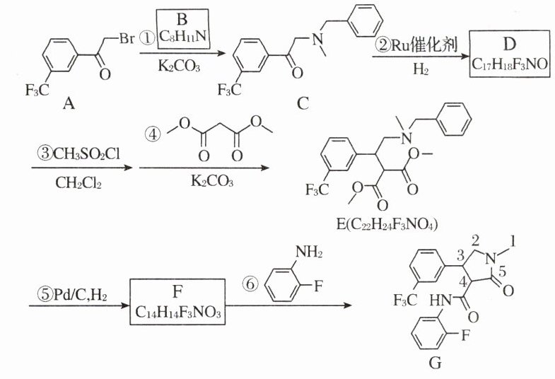 。(5) F 的结构简式是 ____;反应⑤分两步进行,第一步产物的分子式为$ \mathrm{C}_{15}\mathrm{H}_{18}\mathrm{F}_3\mathrm{NO}_4,$其结构简式是 ____。(6) G 中手性碳原子是