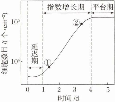 D 动物细胞培养所需气体主要有O₂和CO₂,O₂是细胞代谢所必需的。传代培养时,培养皿不能密封,A错误。处于指数增长期的细胞形态和生理特性相对稳定,适合进行传代培养,离体培养的细胞生命力比较脆弱,需要适应培养基的环境,传代最好在细胞生长覆盖瓶底80%~90%进行,选取②的细胞进行传代培养比①更合理,B错误。题干显示从小鼠胚胎中分离获取胚胎成纤维细胞进行贴壁培养,贴壁细胞需要重新用胰蛋白酶等处理,使之分散成单个细胞,然后再用离心法收集,C错误。悬浮培养的细胞会因细胞密度过大、有害代谢物积累和培养液中营养物质缺乏等因素而分裂受阻,因此,细胞增长进入平台期可能与细胞密度过大有关,D正确。