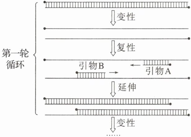 D 由图可知,以原来的每条母链为模板经第一轮合成的两个DNA分子中,只含有引物A或引物B,而以新合成的子链为模板合成新DNA分子时,两种引物都含有,故第三轮循环共产生8个DNA分子,其中含有引物A的分子是6个,即占7/8,D错误。