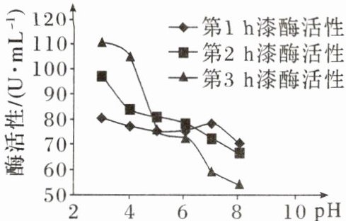 1. (2024·长沙高二检测)杂色云芝菌(一种真菌)盛产漆酶(能分解纤维素等)。科研人员将杂色云芝菌的菌丝接种到液体培养基中,适宜条件下培养不同的时间,提取酶并研究 pH 对酶活性的影响,结果见下图。相关叙述错误的是