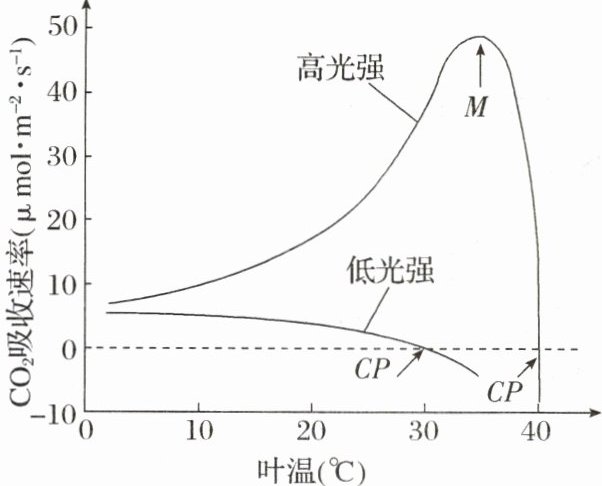 C CO₂ 吸收速率代表净光合速率,低光强下,CO₂ 吸收速率随叶温升高而下降的原因是呼吸速率上升,需要从外界吸收的 CO₂ 减少,A 正确;在高光强下,M 点左侧 CO₂ 吸收速率升高主要原因是光合酶的活性增强,B 正确;CP 点代表呼吸速率等于光合速率,植物可以进行光合作用,C 错误;图中 M 点处 CO₂ 吸收速率最大,即净光合速率最大,也就是光合速率与呼吸速率的差值最大,D 正确。