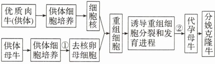 (2)利用体细胞核移植技术克隆优质肉牛的实验在对供体细胞进行培养时,要用胰蛋白酶、胶原蛋白酶处理健康动物的组织,使细胞分散成单个细胞;诱导重组细胞分裂常用的化学物质有Ca²⁺载体、乙醇、蛋白酶合成抑制剂等;图中①②所涉及的实验技术名称是①显微操作去核法,②胚胎移植技术。
