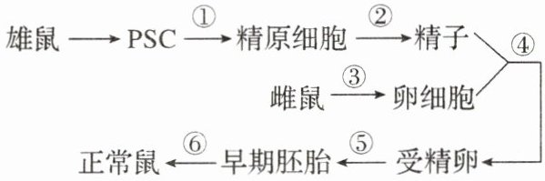 4. (多选) 科研人员利用如下图所示的流程, 将小鼠多能干细胞 (PSC) 诱导成为精子, 并使其成功与卵细胞在体外受精, 得到正常后代。下列叙述不正确的是 ( )