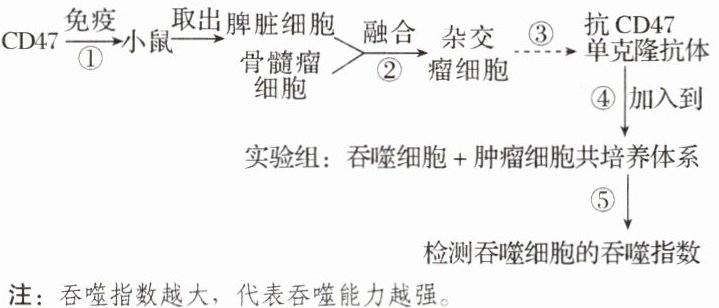 3. (2024·桂林质检) CD47 是一种在多种细胞中广泛表达的跨膜糖蛋白, 能够与巨噬细胞膜上的受体结合, 并抑制其吞噬作用。结肠癌等多种癌细胞表面的 CD47 含量比正常细胞高 1.6~5 倍。科研大员制备抗 CD47 的单克隆抗体, 以探究其对巨噬细胞吞噬作用的影响。过程如下图所示, 下列说法正确的是 (