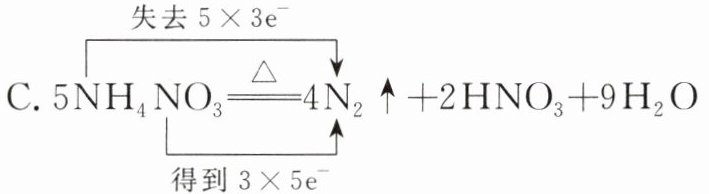 选项C:$NH_4NO_3$中$NH_4^+$的N元素从-3价升高到0价,失去$5×3e^-$;$NO_3^-$的N元素从+5价降低到0价,得到$3×5e^-$,电子转移表示正确。